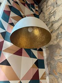 Lampada a sospensione a cupola, luce diretta, colore esterno bianco, colore interno foglia oro (la pare esterna è realizzata in vernice cemento bianco mentre quella interna è in nebulite colorata). Diametro 46cm, h. 27,5 cm , colore cavo trasparente, rosone 12x4.5 cm. Attacco per lampadina (led) E27, non inclusa. Pari al nuovo, presente in esposizione in un negozio di illuminazione. Ideale per illuminare il tavolo da pranzo.