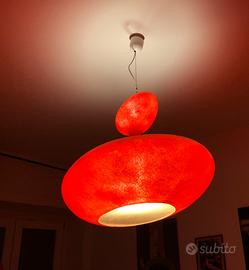 Lampada a sospensione di design italiano Kundalini ETA, colore rosso. La lampada è in buone condizioni ma sulla membrana nella parte inferiore presenta alcuni graffi (foto 3) dovuti a un trasloco. Trattandosi di un semplice foglio di plastica translucida, volendo si può togliere e/o sostituire artigianalmente.