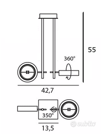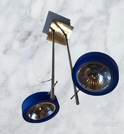 Feel 2 Sospensione, lampada da parete/soffitto con 2 luci, diffusori orientabili in senso verticale di 300°, in senso orizzontale di 350°. Diffusore in vetro pressato cristallo con finitura blu satinato. Montatura in metallo con finitura nichel spazzolato e particolari cromati. Sorgente luminosa Eco-incandescenza: 1 x max 50W Halospot 111 per punto luce, oppure Eco-alogena, oppure LED Dimensioni: Larghezza 43 cm X Altezza 55 cm NUOVA, mai usata, senza imballo originale