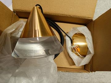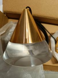 Lampada a sospensione di piccole dimensioni, modello Verdi di Linealight, perfetta come luce da comodino , sopra il bancone della cucina oppure decorativa vicino ad uno specchio. Lampada nuova, completa di imballo originale. Materiale metallo finitura oro e diffusore in vetro. Luce calda 3000K. Disponibili 3 pezzi.