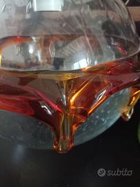 Lampadario vintage anni 60 70 a sfera in vetro di murano bullicante soffiato a bocca attribuibile a Mazzega con boccia in vetro con presenza di bollicine dovute alla soffiatura del vetro e decoro intorno in vetro colato color ambra