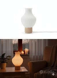La lampada è composta da una base scanalata e da un paralume scultoreo con un collo delicatamente stretto, che le conferisce una silhouette elegante ed equilibrata. È ideale come lampada da comodino, luce d'accento per il soggiorno o elemento decorativo per interni moderni e minimali.