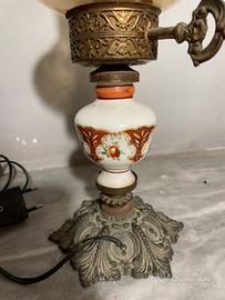 antica abatjour con base in metallo. pomo in ceramica con motivi floreali ed ampolla in cristallo. Lampada da tavolo vintage, con dettagli in porcellana e finiture dorate.