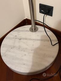 Lampada da terra ad arco in acciaio con base in marmo bianco. Stile senza tempo che ricorda la celebre “Arco” di Flos. Una lampada tipo E27, interruttore a pedale. Lunghezza 85-210 cm regolabile in altezza.