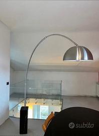 lampada ad arco, copia della iconica Flos dei fratelli Castiglioni. base in marmo nero e stelo in tubo acciaio tondo