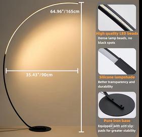 Lampada da terra moderno modello a LED ad arco, noto per il suo design minimalista e la capacità di regolare la temperatura del colore (da 3000K a 6000K) e l'intensità luminosa con telecomando