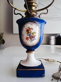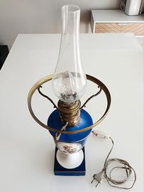 Vendo bellissima lampada - lume a petrolio d'epoca anni '50, successivamente elettrificato per l'uso moderno. Design classico ed elegante, con corpo in ceramica o porcellana. Presenta una base blu cobalto con un medaglione centrale a fondo bianco, decorato con una pittura floreale policroma fatta a mano. La base quadrata e il collo della lampada sono rifiniti con elementi in ottone. La parte superiore è costituita da un camino in vetro trasparente a forma di "tulipano", tipico delle lampade a cherosene. Davvero molto bella, solo da ripulire e lucidare gli ottoni. Lampada funzionante.
