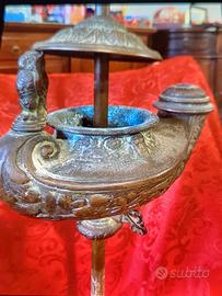 Lampada ad olio, stile orientale in ottone con decorazione di piccolo gufo. Lampada da minatore a mano o da tavolo. Misure Altezza cm 60
