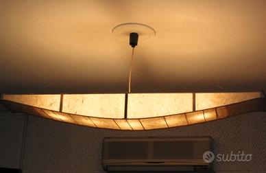 Rovere, Abete e Whashi (carta giapponese). Una luce diffusa e morbida in una forma che ricorda certe imbarcazioni orientali. E' illuminata da strisce di Led alimentate a corrente continua (12÷18 v.) Fatta a mano.