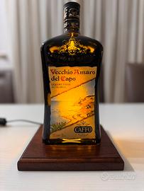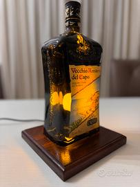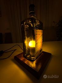 Lampada realizzata artigianalmente con base in legno e dotata di filo con bottone per accensione a presa piccola.