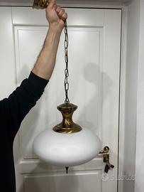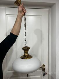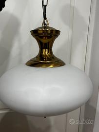 lampada a sospensione in ottone e vetro opalino, di produzione italiana, risalente agli anni '60 circa.