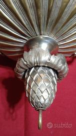 lampada antica votiva o da soffitto in vari metalli argentati decorata a sbalzo e applicazioni in fusine, la pigna e in argento, mancano le catene per appenderla, il vetro copri fiamma non e originale.