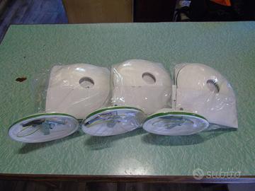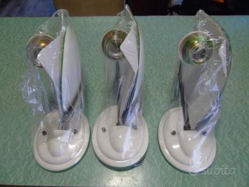 VENDO 3 LAMPADE APPLIQUE OBLIQUE DA PARETE IN CERAMICA BIANCA CON BORDO VERDE BRACCIO IN OTTONE STILE VINTAGE, MADE IN ITALY, NUOVE MAI UTILIZZATE, SONO ANCORA NEL SUO IMBALLAGGIO ORIGINALE. IL PREZZO E' RIFERITO AD 1 LAMPADA, VENDO ANCHE SINGOLARMENTE.