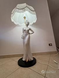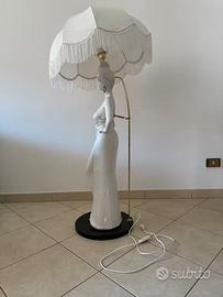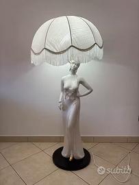 Bellissima e caratteristica lampada-statua d'arredo, rappresentante figura femminile, in ceramica bianca con rifiniture dorate. La statua è praticamente nuova, non essendo mai stata usata Ritiro a Termoli, si potrebbe valutare la consegna anche in zone limitrofe DIMENSIONI: Altezza totale con paralume: 125 cm Altezza paralume: 25 cm Altezza statua:100 cm Diametro paralume: 60 cm