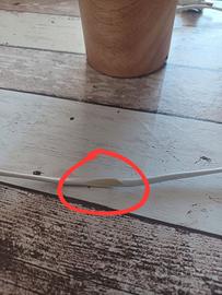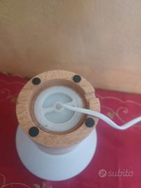 Lampada da arredo in legno e ceramica ottime condizioni. La parte in ceramica ha dei fori per far passare la luce. Altezza 20 cm, diametro parte bianca in ceramica 18.5 cm circa. Il filo in un punto è schiacciato vedere foto.