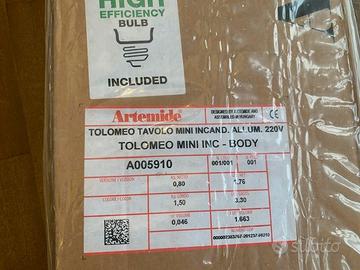 Artemide Tolomeo mini con supporto fisso, nuova nell'imballo originale. Lampada aperta solo per la vendita e richiusa nel suo contenitore. La lampada verrà corredata del supporto fisso come da fotografia, anche esso nuovo. Attacco per lampada E27.