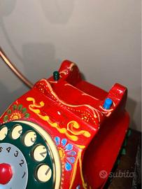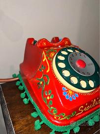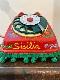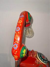 Lampada artigianale unica realizzata con telefono vintage a disco, decorato e dipinto a mano in stile tradizione siciliana. Il ricevitore è stato trasformato in portalampada, creando un pezzo originale che unisce design retrò, arte popolare e riuso creativo. Colori vivaci rosso e verde, dettagli floreali e scritta “Sicilia” sul corpo. Perfetta come lampada da tavolo, luce d’accento o pezzo decorativo per ambienti creativi, case vintage, locali o studi. 🔹 Pezzo unico 🔹 Stile folk / siciliano / retrò 🔹 Lampadina inclusa 🔹 Funzionante 🔹 Ottime condizioni Ideale per chi ama l’arredo originale e gli oggetti con carattere.