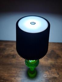 Lampada artigianale realizzata con tre bottiglie di birra di vetro verde, tagliate e levigate per poterne utilizzare la parte superiore.