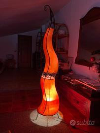 Vendo lampada da terra artigianale in stile etnico, alta 1,60 m, con struttura in ferro battuto e rivestimento color arancio/rosso che crea una luce calda e molto scenografica.