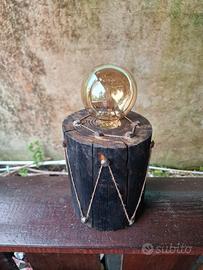 Lampada fatta a mano con tronco di pino bruciato, dettagli in corda e chiodi vintage. Oggetto unico dallo stile rustico e vissuto, ideale per arredamenti in stile chalet, industrial o country.