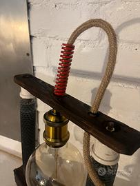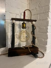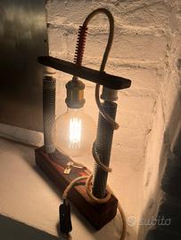 Lampada da tavolo artigianale unica, realizzata a mano con materiali recuperati e lavorazioni curate nei dettagli.