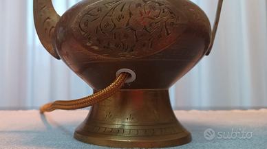 Lampada su brocca vintage mediorientale in ottone con incisioni. H cm 46 compresa lampadina H cm 30 senza lampadina L max cm 23