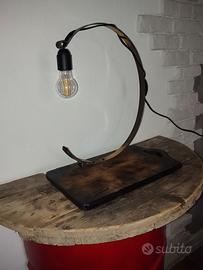 lampada realizzata con vecchio cerchio stringi tubo verniciato su base tagliere in legno.