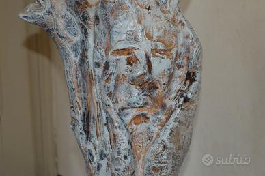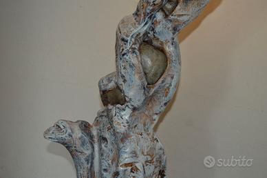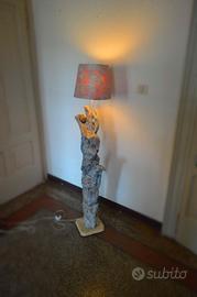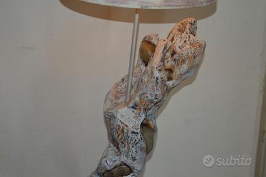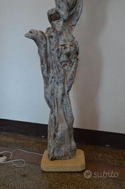Radice d’albero sradicata dall’impeto di un fiume e poi ritrovata abbandonata in una spiaggia, contiene ancora intrappolati tre sassi avvolti dalle radici. Opera d’arte con un procedimento di lavorazione particolare. Messa in una vasca d’acqua a bollire per ammorbidire ciò che con glia anni si era attaccato. Successivamente passata con getto d’acqua alta pressione per togliere il residuo, successivamente scolpita a mano per scoprire i segreti delle forme, piallata, levigata, e bruciata con la fiamma ossidrica, spazzolata e colorata. Il basamento è in pietra di Vicenza e il legno è di carpino nero. Munita di interruttore a piede. Pezzo unico