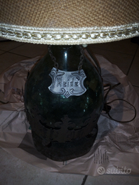 Vendo lampada in vetro verde scuro, forma a fiasco, con base in legno e decori in metallo. Eventuale coprilampada beige compreso.