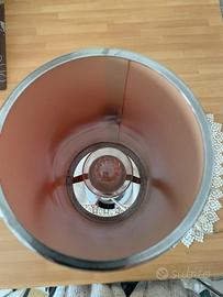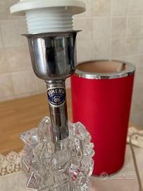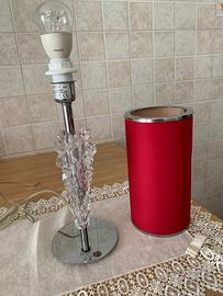 Lampada da tavolo elegante con base cromata e dettagli in cristallo trasparente. Paralume cilindrico rosso con bordi cromati. Il paralume presenta un piccolo difetto dovuto al calore, con una leggera piega visibile da vicino (vedi foto). Perfettamente funzionante. Altezza 45 cm
