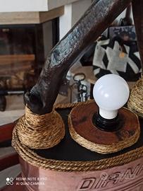 lampada con basamento in rame costruita con vecchia pompa per verderame e legna di mare