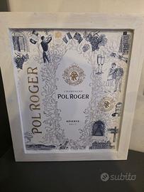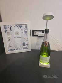 Vendo lampada artigianale creata a mano, di una bottiglia di champagne e un quadro con il cartone della bottiglia. le luci sono a led e posso essere accese separatamente, la luce principale è snodabile.
