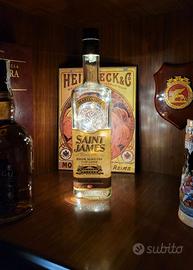 Lampada d'atmosfera/punto luce, bottiglia Saint James (vuota), è un pezzo unico per arredare e decorare casa, il tavolo da cena, la libreria, il comodino, il tavolo del giardino etc. Con striscia Led white 2 metri + seconda striscia led di scorta, 2 metri, a tre modalità luce (nuove) Alimentate da: 3 x batteria a bottone LR44 (Comprese)