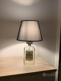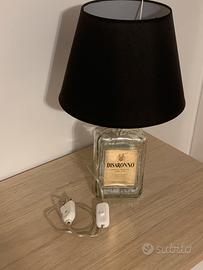 Bellissima lampada da tavolo realizzata con una bottiglia di Disaronno. Ha un paralume neroe una base in vetro trasparente.