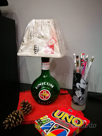 Lampada ottenuta dalla bottiglia da 70 cl di amaro Unicum. D'effetto sia su un mobile, uno scaffale, un comodino o una scrivania. Composta da un paralume in tela (diam. circa 15/20cm - altezza circa 10 cm), porta lampada E14, lampadina non inclusa, cavo nero con interruttore. Pronta consegna.