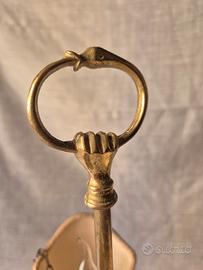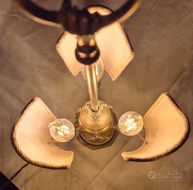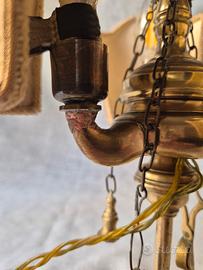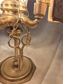 Splendida lampada Bouillotte in stile Impero realizzata in ottone massiccio. Questo modello nasce storicamente in Francia per illuminare i tavoli da gioco (il gioco della Bouillotte), caratterizzato dai suoi eleganti paralumi schermi e dalla struttura a candelabro Caratteristiche e Preai: Modello: Bouillotte a 3 fiamme con portalampada a candela. Materiale: Ottone con patina originale, base circolare sagomata e fusto centrale che termina con la tipica impugnatura ad anello per essere spostata facilmente Paralumi: 3 schermi orientabili in tessuto pregiata con ricami floreali damascati, perfetti per diffondere una luce calda e d'atmosfera Accessori: Completa di catenelle decorative originali a cui sono appese le forbici smoccolatoio spegni-fiamma) in ottone. Intervento di Restauro: L'oggetto è stato restaurato per essere utilizzato subito in sicurezza: Elettrificazione completa: Nuovo impianto elettricc con cavo color oro. interruttore e spina coordinati Riparazione strutturale: Come evidenziato nelle foto (in particolare la n. 8), un braccio è stato rinforzato con una saldatura artigianale che ne garantisce la stabilità (il prezzo tiene conto di questo dettaglio) Condizioni: Ottime condizioni estetiche, i paralum sono integri e l'ottone presenta la belissima patina del tempo.