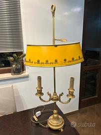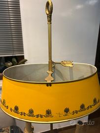 • Paralume: In "tôle" (lamiera verniciata) di un raro color giallo ocra, decorato con motivi a palmette dorate.