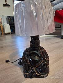 Lampada da tavolo in stile indiano, statua in porcellana nera con paralume in tessuto tecnico grigio chiaro. funzionamento 220 V.