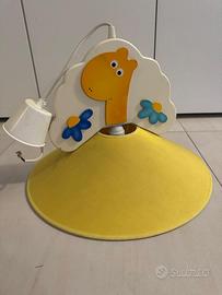 Lampada per arredamento camera bambini con figure (giraffa e fiori) in legno in rilievo e paralume in tessuto giallo