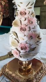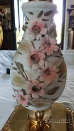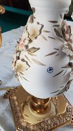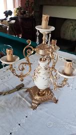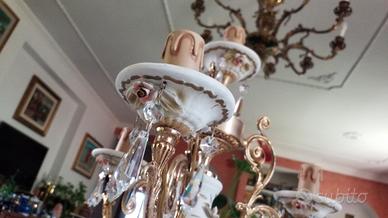Pregiata lampada da tavolo a candelabro a 4 luci, autentica manifattura Capodimonte, come certificato dal marchio storico (N coronata blu) visibile in foto. Un pezzo d'arte e arredamento che unisce la tradizione della porcellana italiana alla lucentezza dell'ottone. Caratteristiche principali: Autenticità: Marchio originale Capodimonte Made in Italy. Materiali: Struttura in ottone dorato finemente lavorato e corpo centrale in porcellana bianca decorata con delicati fiori (rose) applicati a mano in rilievo. Dettagli di pregio: Arricchita da eleganti pendenti in cristallo e copri-portalampada a forma di candela. Dimensioni: Altezza 45 cm, Larghezza 40 cm. CONDIZIONI: L'oggetto è in buono stato conservativo. L'ottone è lucido e i pendenti sono completi. Si segnala, per massima correttezza, piccole sbeccature su petali (visibile solo da vicino e tipica della fragilità delle porcellane d'epoca), che non pregiudica l'estetica generale del pezzo. Impianto elettrico originale e funzionante. Un oggetto distintivo, perfetto per arricchire ambienti classici o come pezzo vintage di carattere.