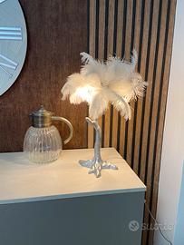 Lampada a led con basamento in legno foglia argento. Paralume in piume bianche