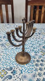 In ottone. La Chanukkiyah è la variante della Menorah e ha nove bracci, viene accesa durante la festa di Chanukkah per ricordare il miracolo dell'olio. Altezza circa 21 cm, larghezza circa 18 cm. Diametro base circa 8 cm.