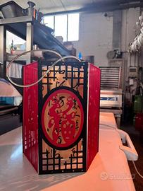 Vendo splendida lampada da tavolo in stile cinese tradizionale. Struttura in legno intagliato nero e rosso con decorazioni orientali e caratteri cinesi. Le pareti laterali sono in tessuto sottile con scritte decorative che creano un effetto di luce caldo e avvolgente. Perfetta per arredare ambienti etnici, zen o per amanti della cultura orientale.