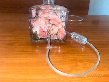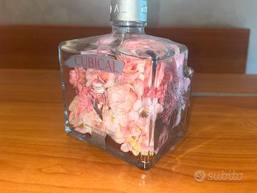 Lampada realizzata artigianalmente utilizzando una bottiglia di gin Cubical. All’interno della bottiglia sono inseriti delicati fiori artificiali rosa che donano un tocco elegante e romantico all’ambiente.