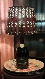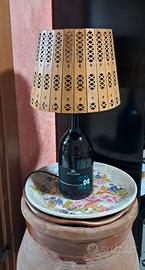 Vendo Lampada costruita artigianalmente con bottiglie di liquore e paralume in legno di pioppo da 4 mm. tutto tagliato ed intagliato a laser con successivo assemblaggio. Altezza complessiva del lume 50 cm. Paralume in legno alto 20 cm di forma conica con diametro inferiore 30 cm e quello superiore 20 cm.