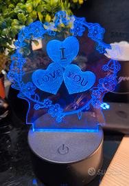 Lampada decorativa con design a cuori e scritta I Love You. La cornice floreale aggiunge un tocco romantico.