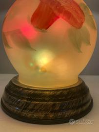 Lampada da tavolo con base decorata e paralume e corpo centrale in vetro smerigliato, adornati con un motivo floreale dipinti a mano, doppio porta lampada, perfettamente funzionante, pomolo superiore con design elaborato con scanalature e una forma a bulbo che culmina in una punta stilizzata, ottone patinato intarsiato. La lampada dispone di doppia accensione con touch sulla base, e con interruttore, eventuale gemella.