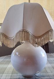 Lampada in ceramica bianca con disegni giallo-oro solo su una facciata. Altezza con paralume 60 cm, larghezza paralume 50 cm, circonferenza lampada 100 cm.