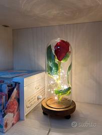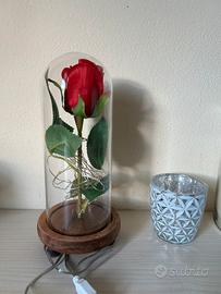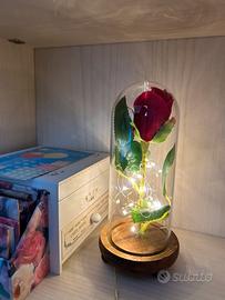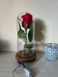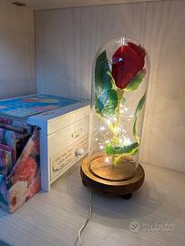 rosa della bella e la bestia, rosa finta in teca di vetro con led.