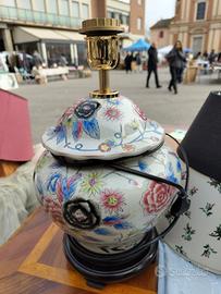 Vaso cinese con motivi floreali trasformato in lampada con paralume color magenta (come da foto).